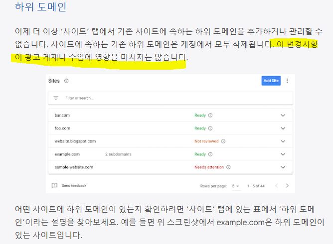 예전에는 애드센스 승인을 받고 나면 하위 도메인별로 설정해서 입력해야 했는데 이젠 자동으로 된다는 것을 말합니다.